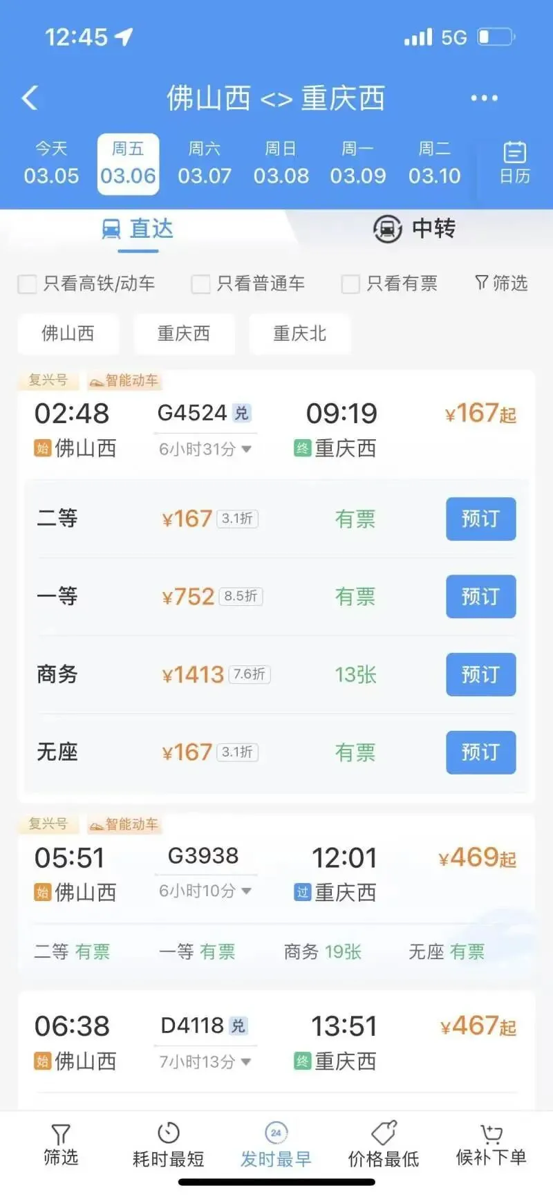 上述列车详情则显示,该趟列车始发站为佛山西,终点站为重庆西,全程6小时31分钟。若购买全程票,二等座为167元,执行3.1折折扣;一等座为752元,执行8.5折折扣,符合席别等级越高、票价越贵的常规认知。值得一提的是,该趟列车贵阳与贵阳北仅一站之隔,车程仅12分钟。有业内人士向记者指出,短途区间票价基数低,折扣叠加后更容易出现席别间的价格反差。